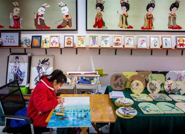铜丝画非遗代表性传承人在工作室给铜丝画掐丝、上色。(受访者供图) |