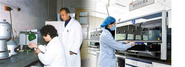 重庆市血液中心工作人员在实验室操作。(左图为1986年的场景,右图为2025年的场景) |