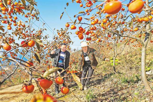 11月13日,巫山县金坪乡柿园,村民正在采摘柿子。