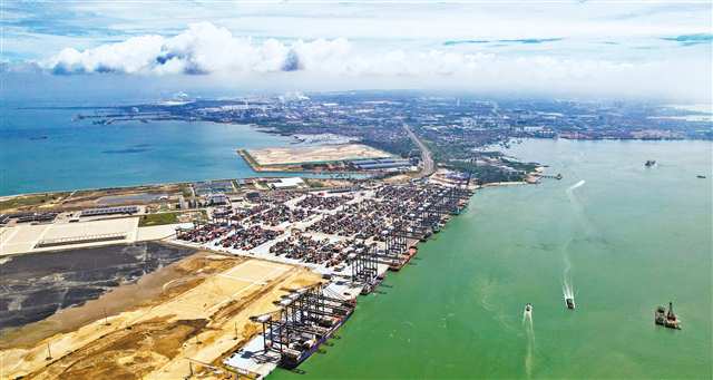 巨轮靠泊,岸桥繁忙作业……海南洋浦国际集装箱码头一派忙碌有序的景象。