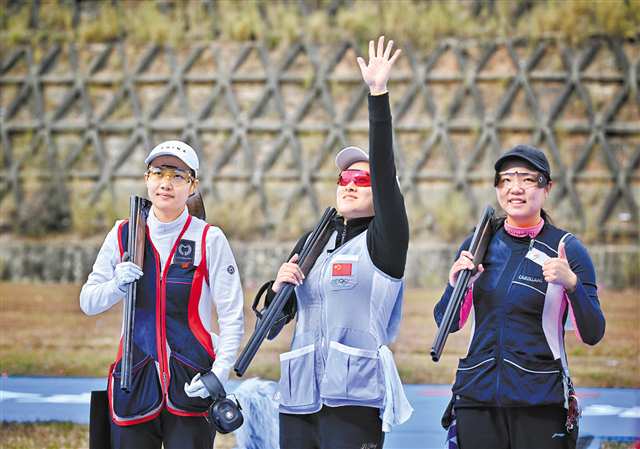 11月19日,广州飞碟训练中心,女子飞碟多向决赛现场,重庆选手范馨月(中)获得冠军。首席记者 龙帆 摄/视觉重庆