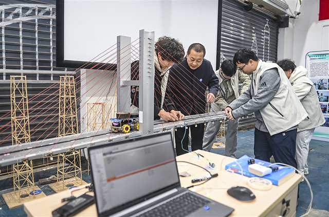 11月17日,重庆交通大学南岸校区,学生在老师指导下进行桥梁传感器布设、线路连接、数据采集以及阈值判别。记者 郑宇 摄/视觉重庆 |