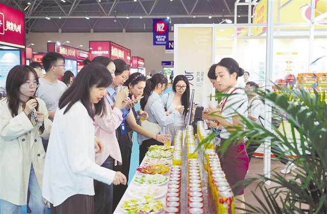 2025重庆市食品及农产品加工高质量发展产业生态大会期间,市民在梁平展馆品尝购买梁平良品 摄/向成国 |