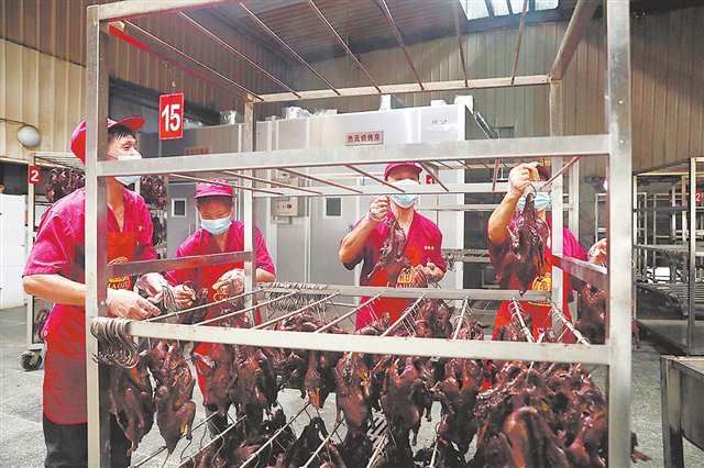 梁平真本味食品有限公司生产车间,工人将卤制后的张鸭子挂上烤架 摄/向成国 |