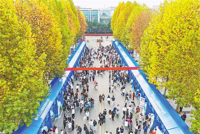 近日,沙坪坝区重庆商务职业学院,2026届毕业生在“渝快就·创未来”重庆市2026届普通高校毕业生商贸服务类专场双选活动上求职。