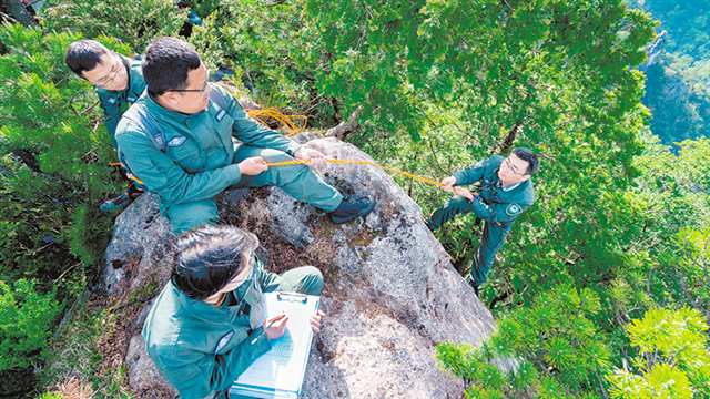 雪宝山国家级自然保护区工作人员正在进行崖柏科研调查。 |