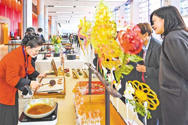 行走在展厅内,龙兴李氏糖人糖画的摊位前甜香四溢,传承人李梅手持铜勺,以糖为墨,以板为纸,勾勒出飞龙彩凤的轮廓,引来阵阵惊叹。不少嘉宾举起手机,记录下糖液从流动到凝固定型的奇妙过程。