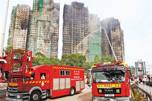 这是11月27日拍摄的香港新界大埔区宏福苑火灾救援现场。此次火灾中,消防处共出动1200多名消防及救护人员,动员超过1000名警务人员协调居民疏散、救援及紧急支援的工作。新华社发 |
