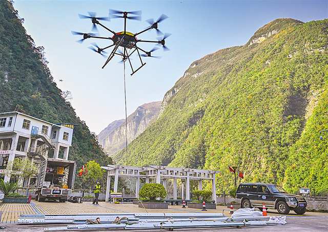 图为改造现场,工作人员在操作重载无人机吊运新建铁塔塔材。记者 崔曜 龙帆 摄影报道/视觉重庆