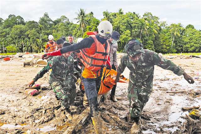 11月30日,在印度尼西亚西苏门答腊省,救援人员搬运一具遇难者遗体。