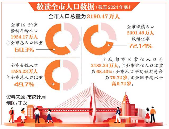 “十四五”以来,我市人口分布继续向城镇和主城都市区集聚。截至2024年底,全市城镇人口为2301.49万人,城镇化率为72.14%;主城都市区常住人口为2183.24万人,占全市常住人口比重为68.43%;全市人口平均预期寿命为79.72岁,比全国平均水平高0.72岁。