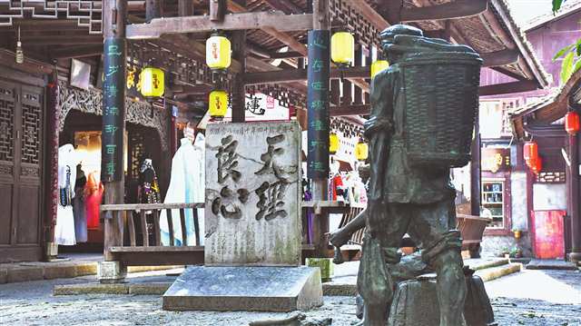 顺着青石板往古镇里走,一方青灰石碑矗立在古镇中心,碑身上“天理良心”四个大字遒劲挺拔,与文化展览馆交相辉映,默默守护着这座古镇的繁华烟火。