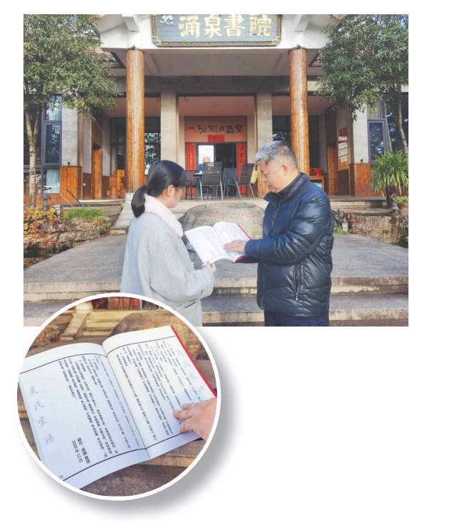 莫英茂(右)向村民讲解莫氏家谱。记者 赵伟平 摄/视觉重庆 |