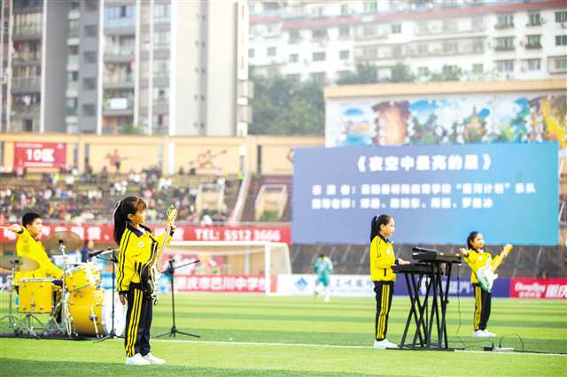12月7日下午,2025重庆城市足球超级联赛(以下简称渝超)云阳恐龙队主场对阵巫溪红池坝队的比赛中场休息时,一支4人乐队现场演奏了一首《夜空中最亮的星》,引得云阳县体育场现场1.3万余名观众齐声合唱——他们就是来自云阳县特殊教育学校的“萤河计划”乐队。