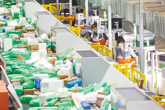 12月10日,位于重庆公路物流基地的申通快递重庆转运中心内,工作人员在流水线上分拣快递包裹。