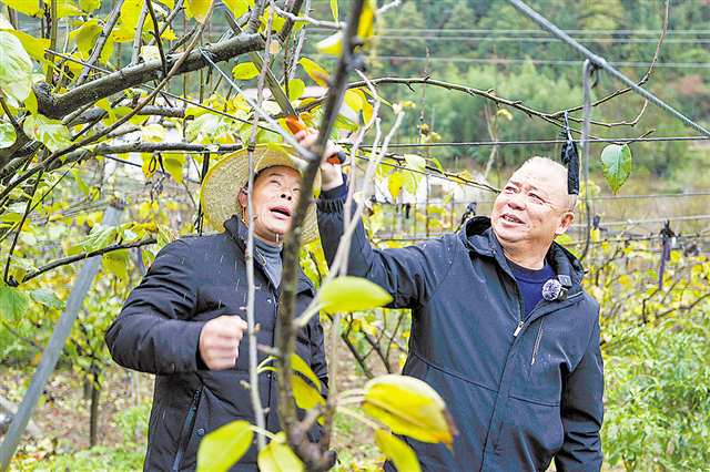 11月17日,巫山县金坪乡袁都村梨园内,来自山东烟台的秋月梨种植专家高飞虎(右)正在查看梨树。 |