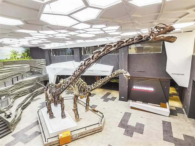 重庆自然资源科普馆大厅展出的三江马门溪龙复原模型(左)。 |