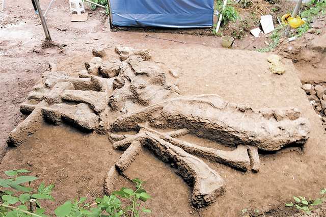 三江马门溪龙化石发掘现场。(本栏图片由重庆市规划和自然资源局提供) |