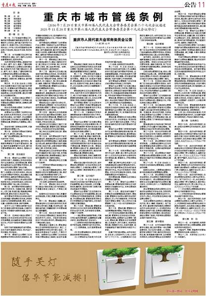 《重庆市城市管线条例》已于2025年11月28日经重庆市第六届人民代表大会常务委员会第十九次会议通过,现予公布,自2026年3月1日起施行。
