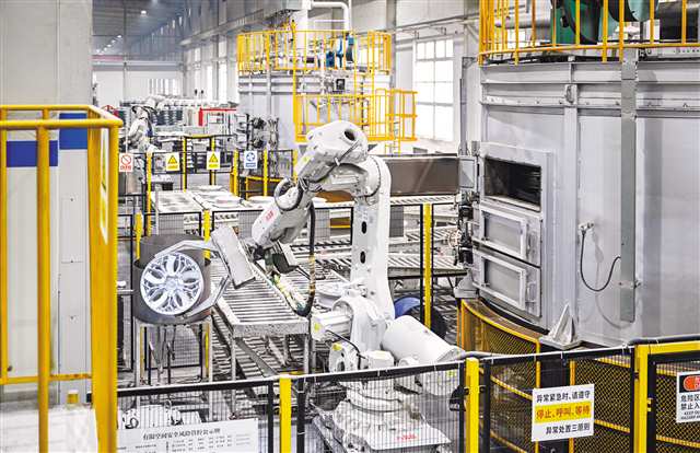 12月15日,位于九龙坡区的重庆戴卡捷力轮毂制造有限公司,机器手臂在铸造车间新增的铝合金旋压轮毂生产线作业。