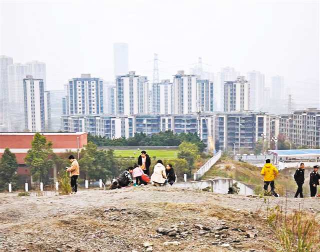 12月15日,市民正在小山包上挖化石,现场已有安保人员劝阻。记者 金鑫 摄/视觉重庆 |