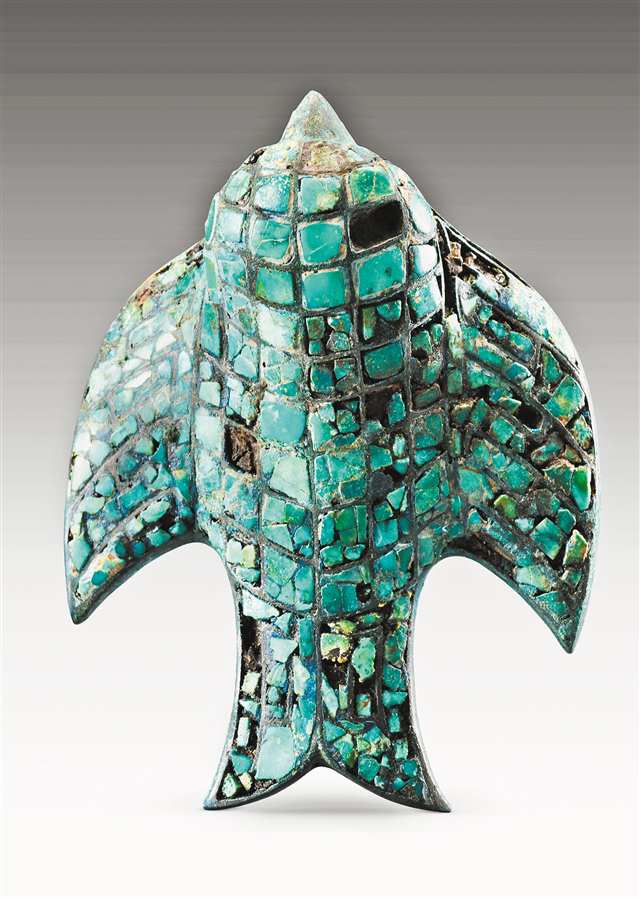 陕西清涧后刘家塔墓地出土的镶绿松石铜饰(资料照片)。