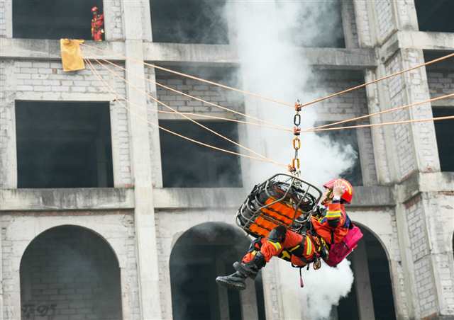 图①:重庆市专业应急救援总队党员突击队的队员进行绳索救援训练。 |