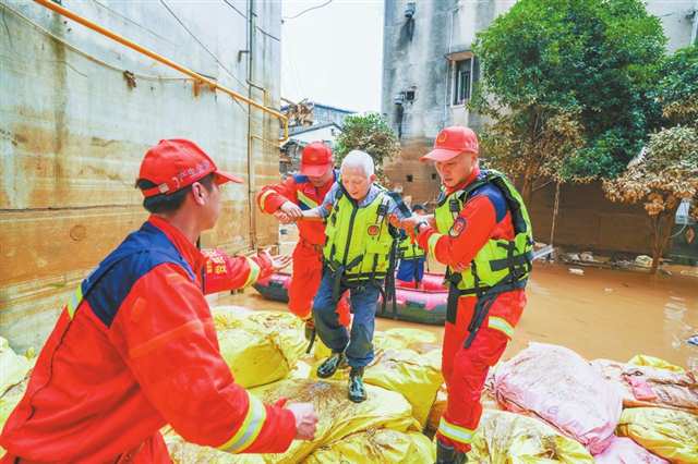 暴雨中,他们身披雨衣、脚踩淤泥,蹚着湍急水流挨家挨户搜救,帮助群众安全转移。