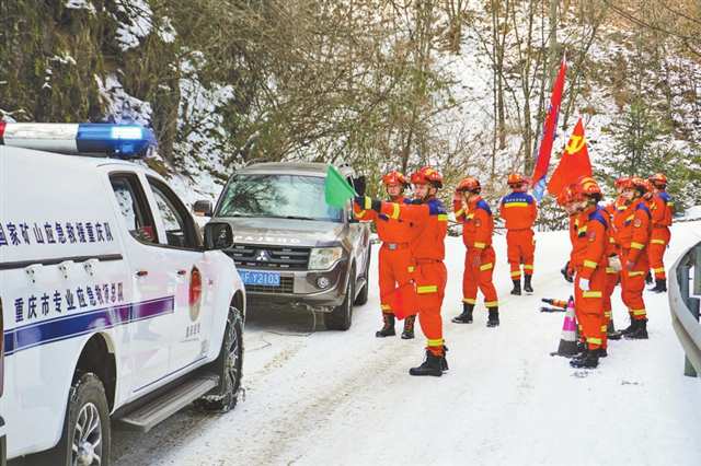 图③:2024年冬天,南川金佛山降大雪影响交通安全,党员突击队队员在现场帮助受困车辆安全驶离。 |