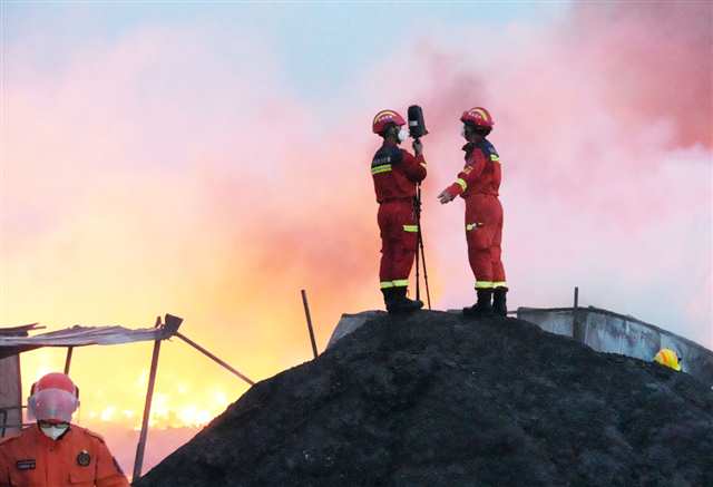 重庆市专业应急救援总队党员突击队队员在火灾事故现场开展抢险救援。