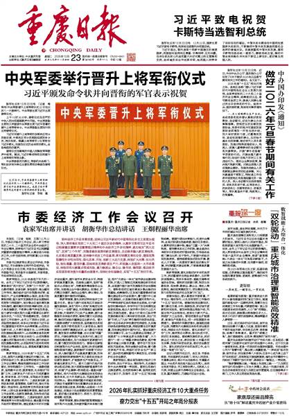 习近平致电祝贺卡斯特当选智利总统中央军委举行晋升上将军衔仪式做好二〇二六年元旦春节期间有关工作市委经济工作会议召开“双轮驱动” 重庆城市治理更智能高效精准