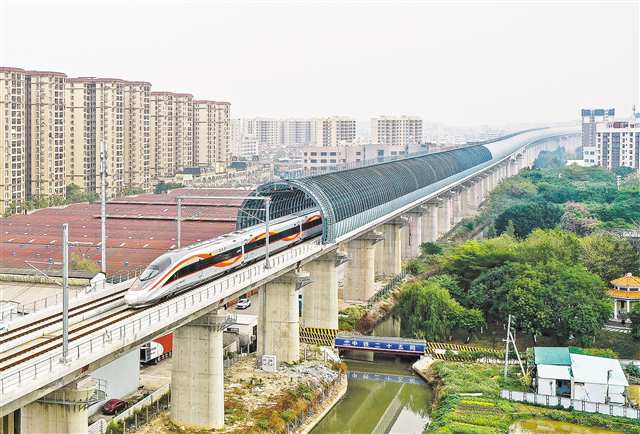12月22日,从广州白云站开往湛江北站的列车穿过高中立交特大桥“隔音隧道”。