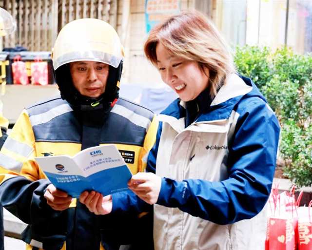 九龙坡区杨家坪街道,党员志愿者为新就业群体解读政策。(受访者供图) |