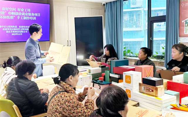 12月16日上午,渝中区七星岗街道抗建堂社区“渝好空间”里,十几位妇女围坐一堂。桌上堆着硬纸板、胶水和裁切工具。