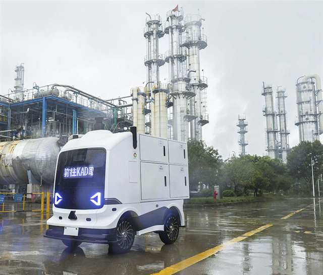 位于涪陵的重庆华峰新材料产业园,装载着样品的自动驾驶小车行驶在厂区。记者 张锦辉 摄/视觉重庆 |