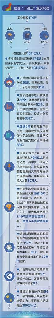以融合之“深”,强产业之“基”,见发展之“效”。“十四五”时期,重庆职业教育成果丰硕:立项建设市域产教联合体36个,备案跨区域行业产教融合共同体52个,建设市级职教集团、虚拟仿真实训基地等362个;职业学校专业对接支柱产业率达88%,为全市3大主导产业集群贡献70%以上新增劳动力,其中新一代电子信息制造业、智能装备及智能制造领域专业供给规模居首,年均输送技能人才超30万人。