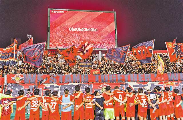 5月3日,铜梁区铜梁龙体育场,重庆铜梁龙全体成员赛后与球迷合影留念。记者 李雨恒 摄/视觉重庆 |