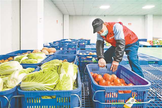 物流配送中心工作人员在检查送往学校的蔬菜。 |