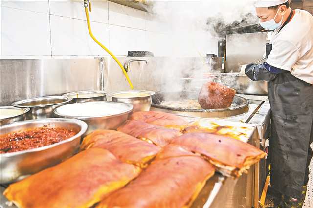 大铁锅里的水哗哗沸腾,大块的鸡肉“扑通”下锅,焯去血水;另一边,肥瘦相间的五花肉已被切成整齐的方块,在热油里“刺啦”作响,慢慢染上诱人的酱红色。各种工序有条不紊进行,香气交织融合,弥漫整个后厨。