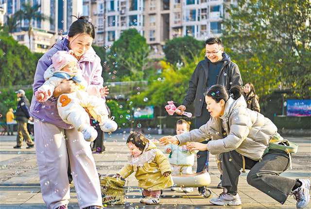 1月6日,南岸区花园路街道南湖社区,家长带着孩子在广场上晒太阳。