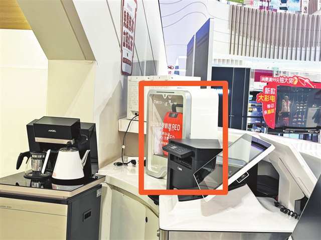 大渡口翠园路66号一家商场前台,AED设备与其他物件放置在一起。
