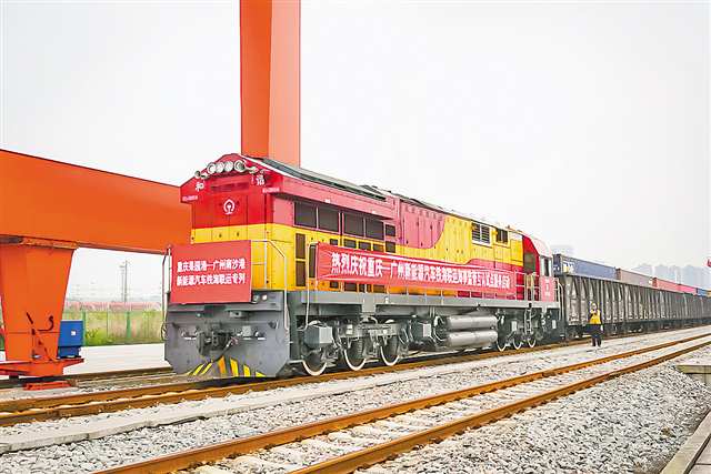 本报讯 (新重庆-重庆日报记者 杨铌紫)1月7日,一列满载有108台“重庆造”新能源汽车的铁海联运专列,从果园港鱼嘴站发出(右图),预计48小时后抵达广州南沙港,随后换装海轮运往中东市场。