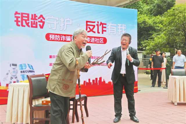 去年9月的一天,沙坪坝区陈家桥街道天马山社区的广场上笑语不断,一场由“检艺银辉反诈普法联盟”带来的特色普法活动正在这里举行。这个特别联盟由重庆市检察院的退休检察官与重庆艺员管理培训中心的老艺术家们共同组成。一场由银发人发起、专门守护银发族的“反诈行动”由此展开。
