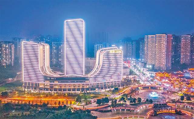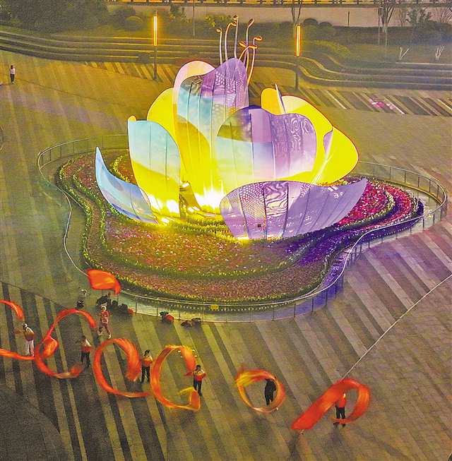 1月13日,巴南区“山·茶花”广场,市民正在锻炼身体(上图)。近日,“山·茶花”广场完成灯饰改造提升工程,“山”字型建筑与广场中心的山茶花雕塑在璀璨灯光中交相辉映(下图),为山城夜景增添了一道独特的风景(无人机照片)。