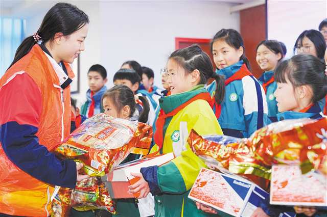 1月13日,北碚区三圣中学校,西南大学附属中学校“行己”青年志愿者给孩子们送上新年“心愿”大礼包。