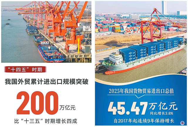 2026年是“十五五”开局之年,回顾极不寻常、极不平凡的“十四五”,我国外贸经受住了外部环境风高浪急的考验,累计进出口规模突破200万亿元,比“十三五”时期增长四成。5年来我国进出口年均增长7.1%,进口国际市场份额保持在10%左右,出口国际市场份额保持在14%以上,实现了“十四五”外贸圆满收官。
