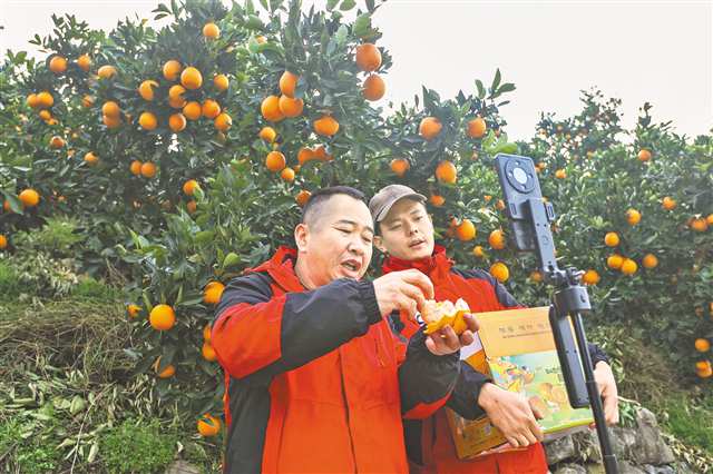 1月15日,巫山县兴胜村柑橘园内,主播在直播带货。记者 尹诗语 摄/视觉重庆 |