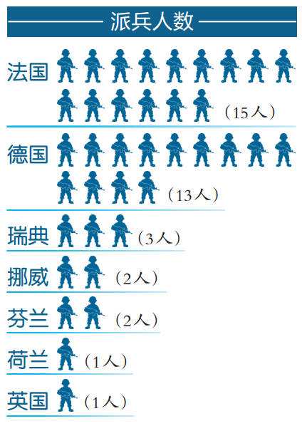 德国之声报道称,德国国防部派遣了一支由13人组成的侦察小组。其他欧洲国家派出的人数也很少,其中瑞典3名军官、挪威2名军官、芬兰2名军事联络官、荷兰和英国各1名军官。