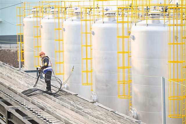 1月14日,万州经开区九龙园,年产3万吨有机溶剂循环利用项目现场,工人正在整理线缆。