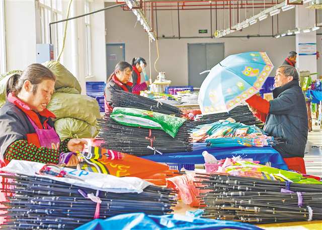 近年来,酉阳县立足资源优势,坚持“强龙头、延链条、补短板、聚集群”发展思路,大力发展雨伞产业。围绕产业上下游链条,累计培育、发展雨伞企业140余家,年产值超10亿元,带动当地超1.5万名群众在家门口就业。
